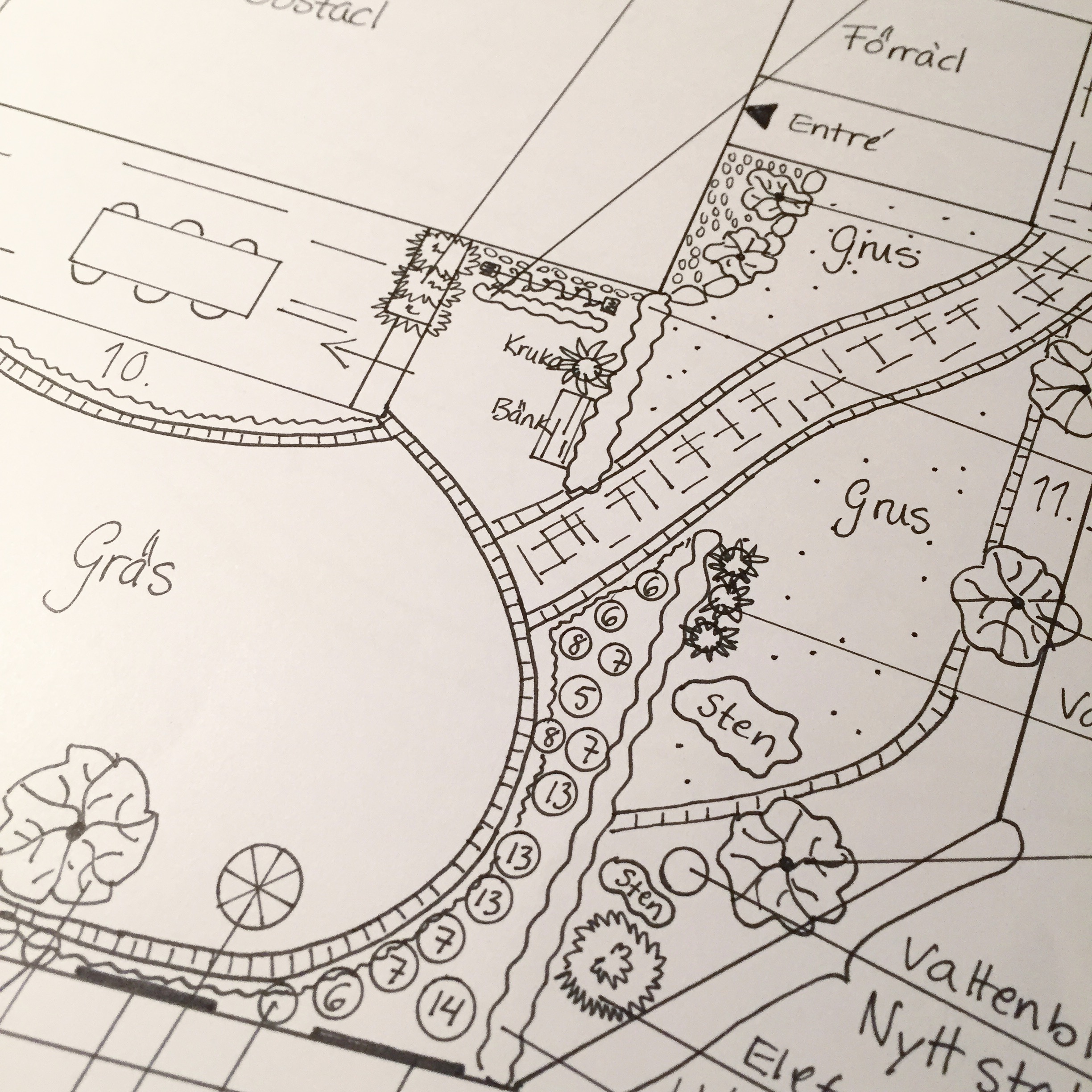 Efter att ha fått tomtritning och många foton på trädgården skapade jag en illustrationsplan med växtlista. Trädgården fick olika rum med hjälp av plank och häckar av avenbok. Vackra perennplanteringar med inslag av rosor och blommande buskar. Altanen utökades och fruktträd och bärbuskar ritades in. Anläggningen påbörjades hösten 2017.