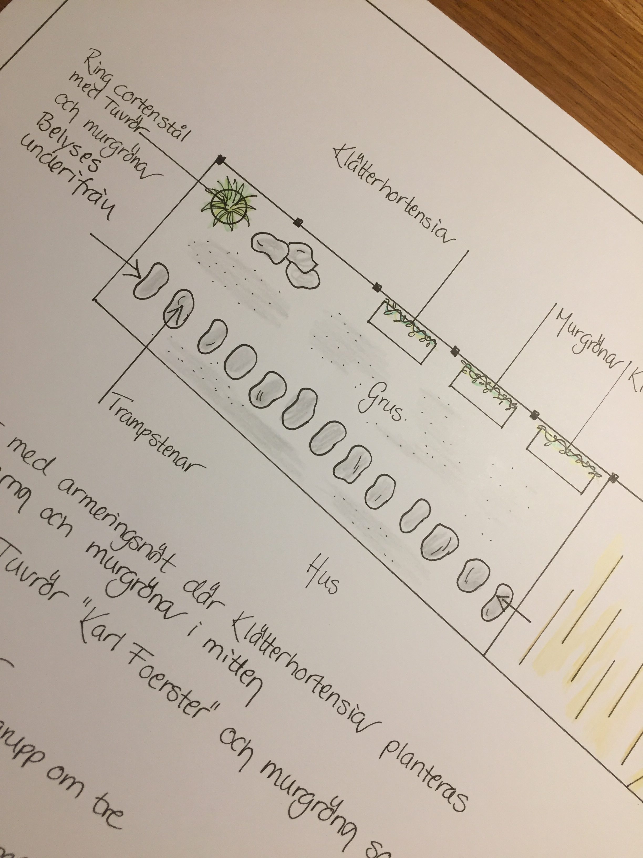 Ett par önskade hjälp med sin villaträdgård. Man ville få förbättringar runt en slänt och även förbättra delar där tomten lutade en del. Paret önskade även hjälp att tänka nytt kring entrén och garageinfarten som hade flera år på nacken. Rabatter behövde förnyas och önskan om ljussättning fanns. Här ritades det en rabatt i flera nivåer i slänten och där tomten lutade som mest planerades en grusad yta in med lättskötta växter som gräs, buxbomsklot och murgröna. Garageinfarten fick ett helt nytt utryck då vacker marksten ersatte asfalten, nya träd ritades in och entrérabatten gjordes mer lättskött. Flera ljuspunkter markerades ut i den nya trädgården för att ”lyfta” vissa träd och gräs. Trädgården planeras att anläggas våren 2019.